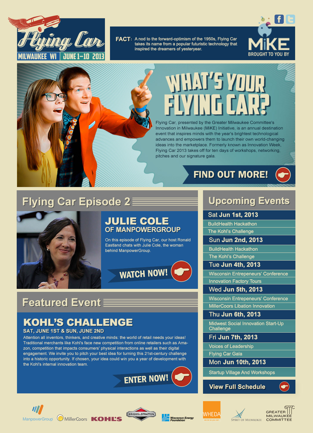 A newspaper insert for Flying Car was created for the Milwaukee Business Journal. The front half highlighted the week's events, interviews with sponsors, and a look into the partners that made the event possible.