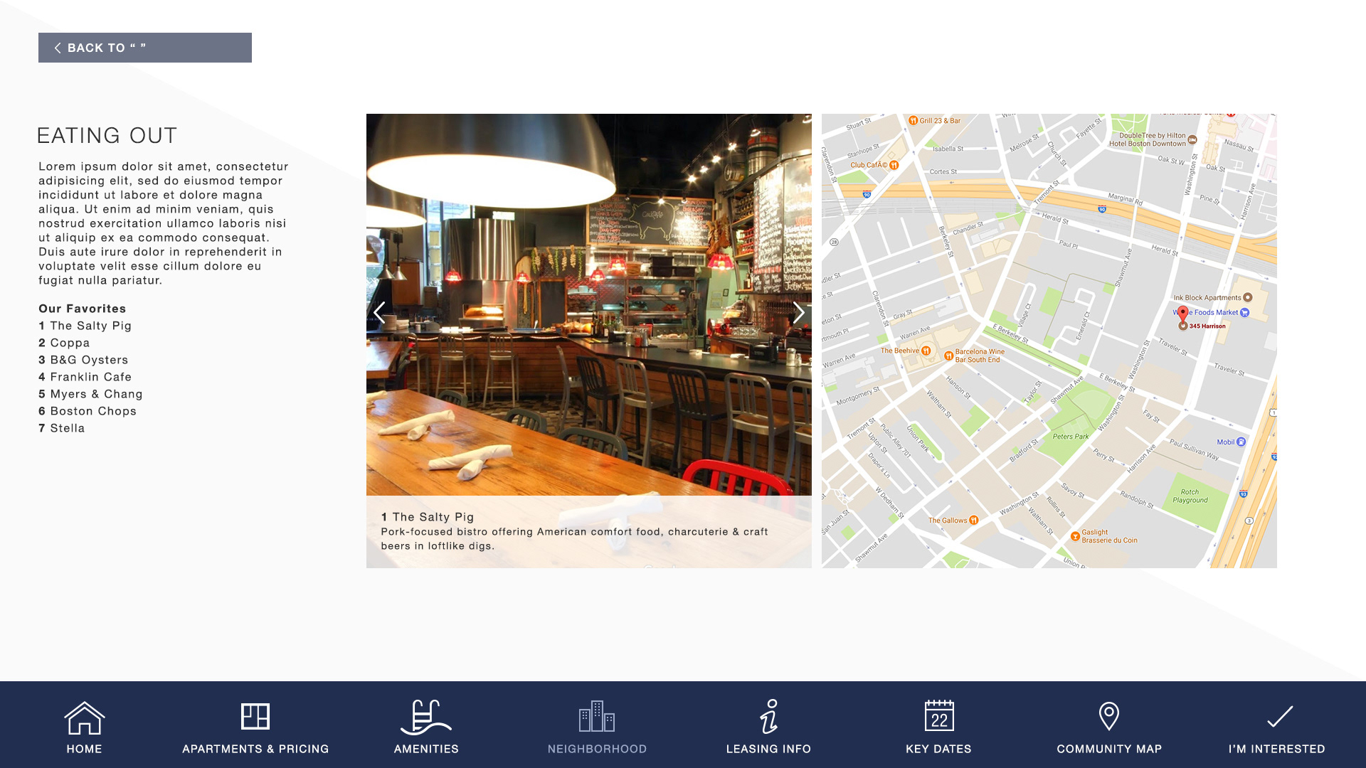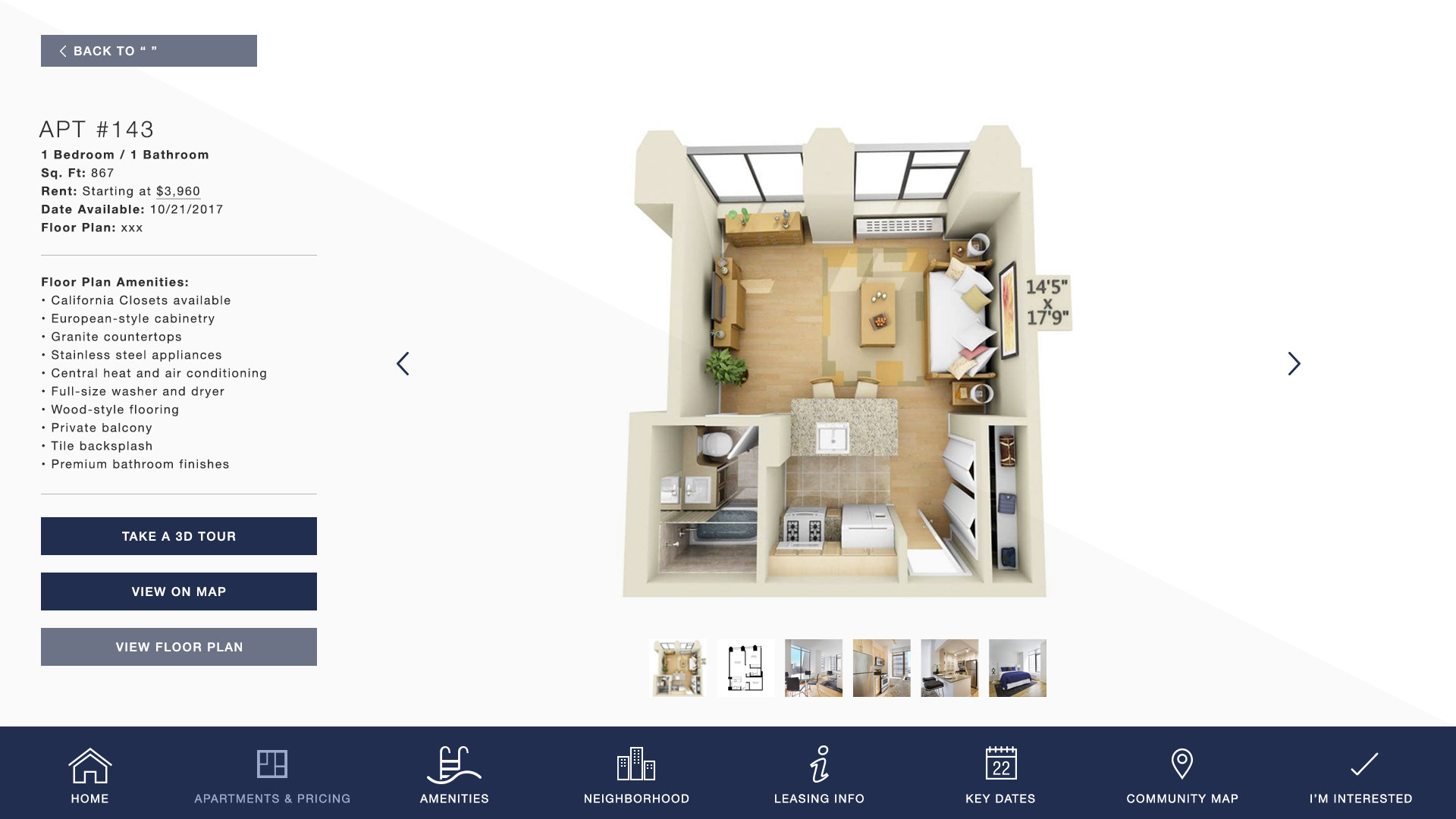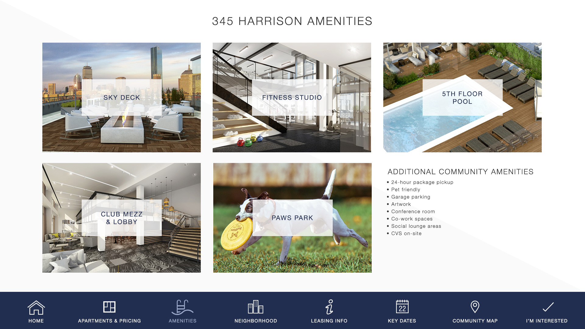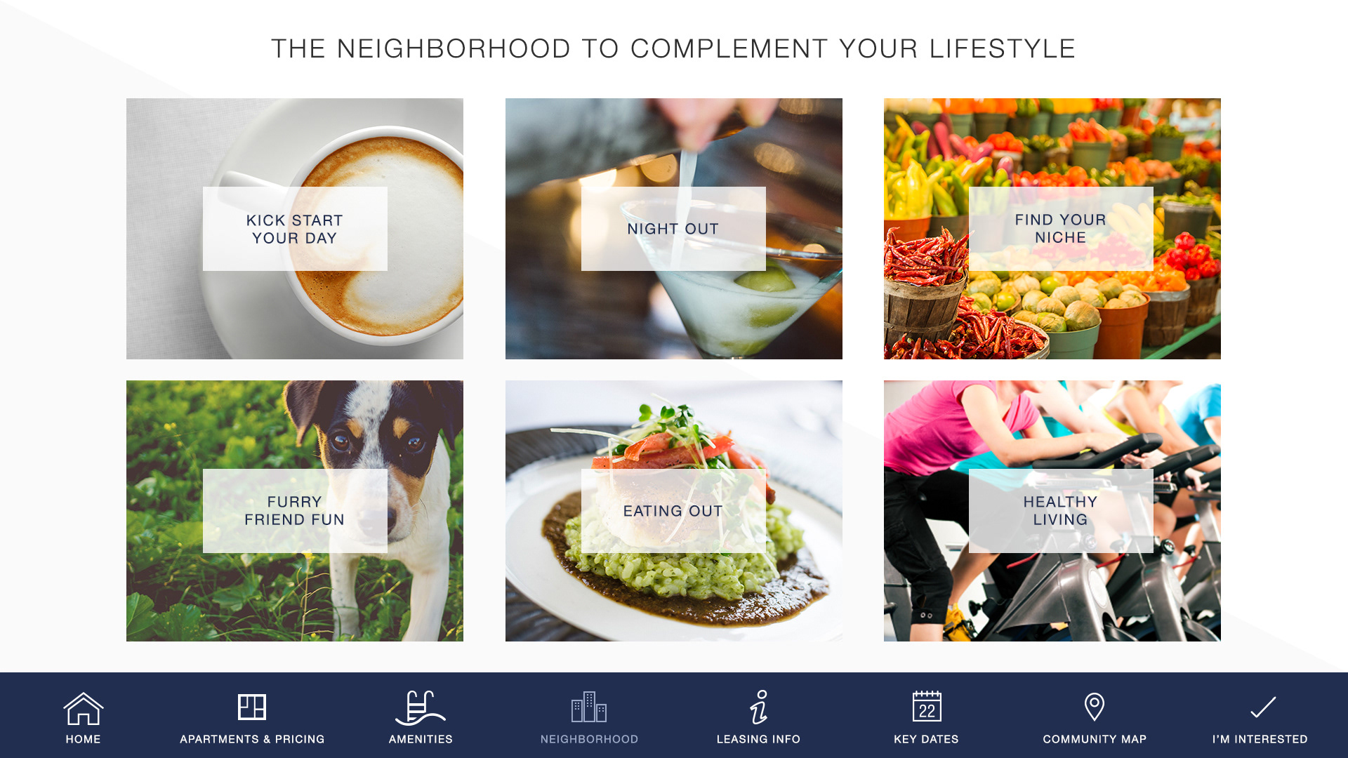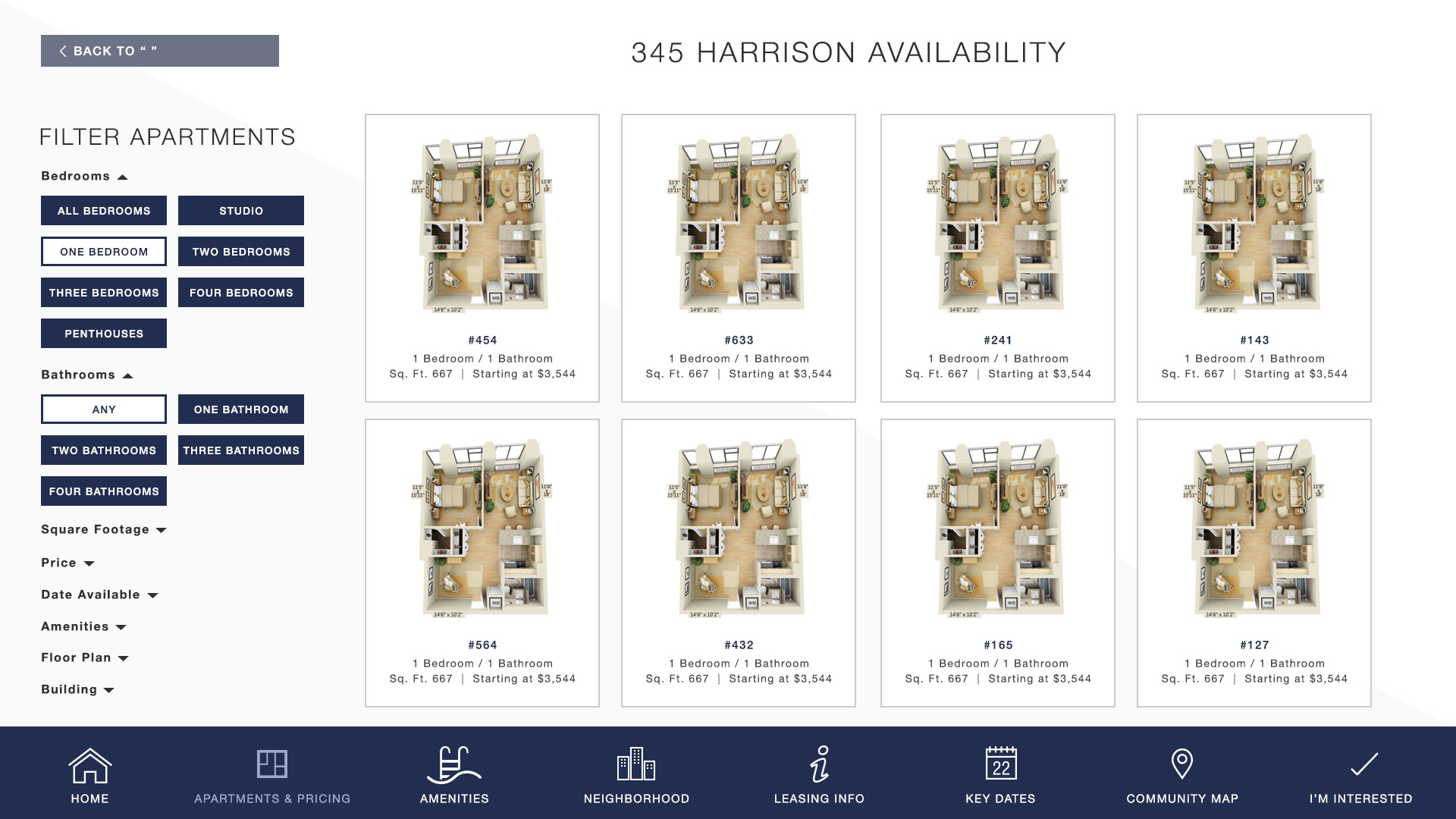 Client: UDR Challenge: To create a touchscreen kiosk to aid prospects in their apartment search journey while a property is still being built. Role: Design, UX/UI